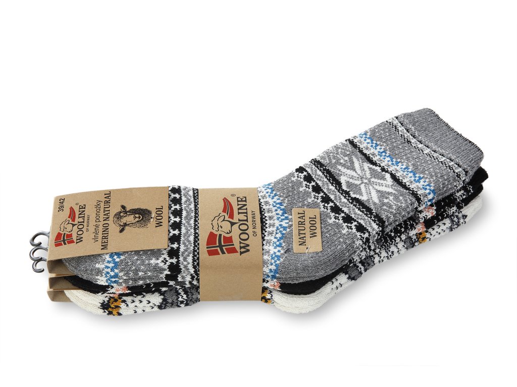 Balenie hrejivých vlnených ponožiek Natural Wooline Wool obsahuje ponožky s nórskymi motívmi, ktoré sú vyrobené z veľmi jemnej a hebkej vlny. Súprava vlnených ponožiek obsahuje 3 páry ponožiek v rôznych motívoch. Motívy zodpovedajú motívom na obrázkoch. Vďaka použitému materiálu sa ponožka prispôsobí veľkosti chodidla.