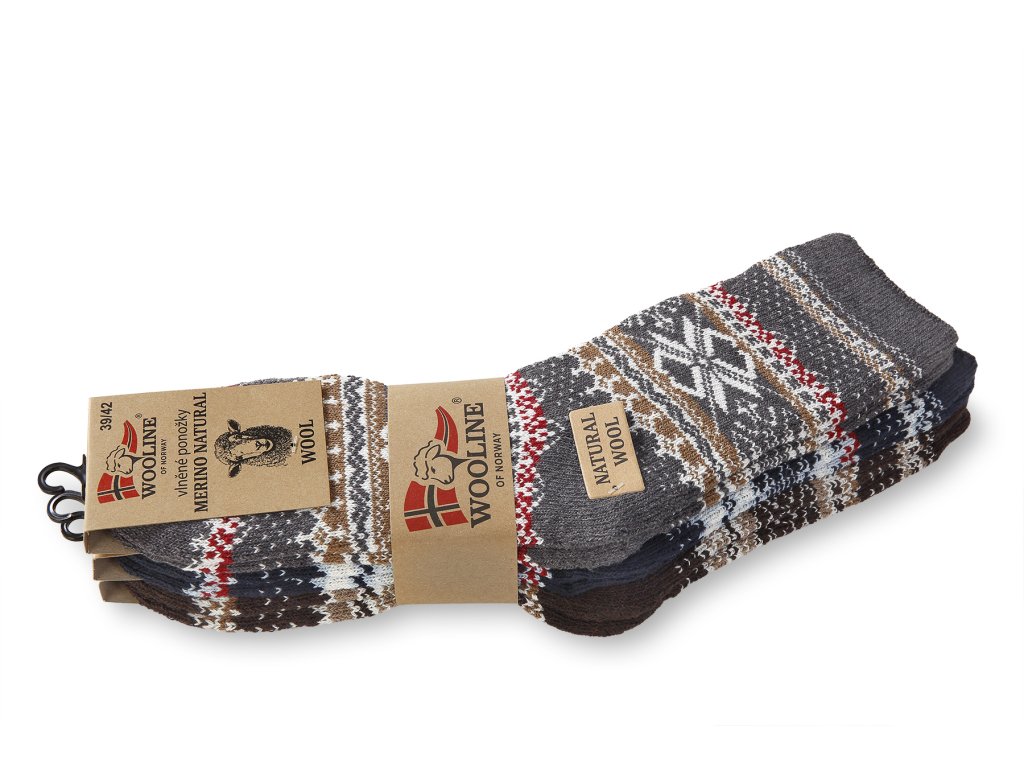 Materiál: 85% Vlna, 10% Bavlna, 5% Elastan; Určené pre: mužov, Veľkosti: 40-43, 44-47, Farba: hnedá, modrá, šedá v nórskych motívovoch