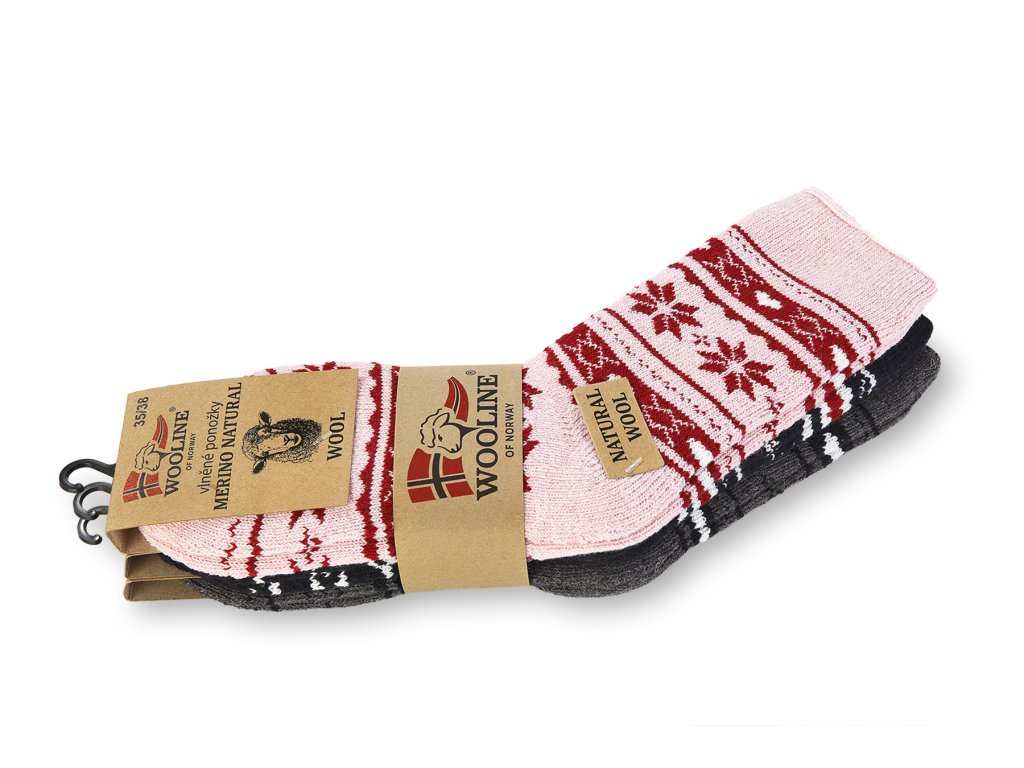 Hrejivé vlnené ponožky Natural Wooline Wool sú vyrobené z veľmi jemnej a hebkej vlny. Balenie vlnených ponožiek obsahuje 3 páry ponožiek v rôznych motívoch. Motívy zodpovedajú motívom na obrázkoch. Vďaka použitému materiálu sa ponožka prispôsobí veľkosti chodidla.