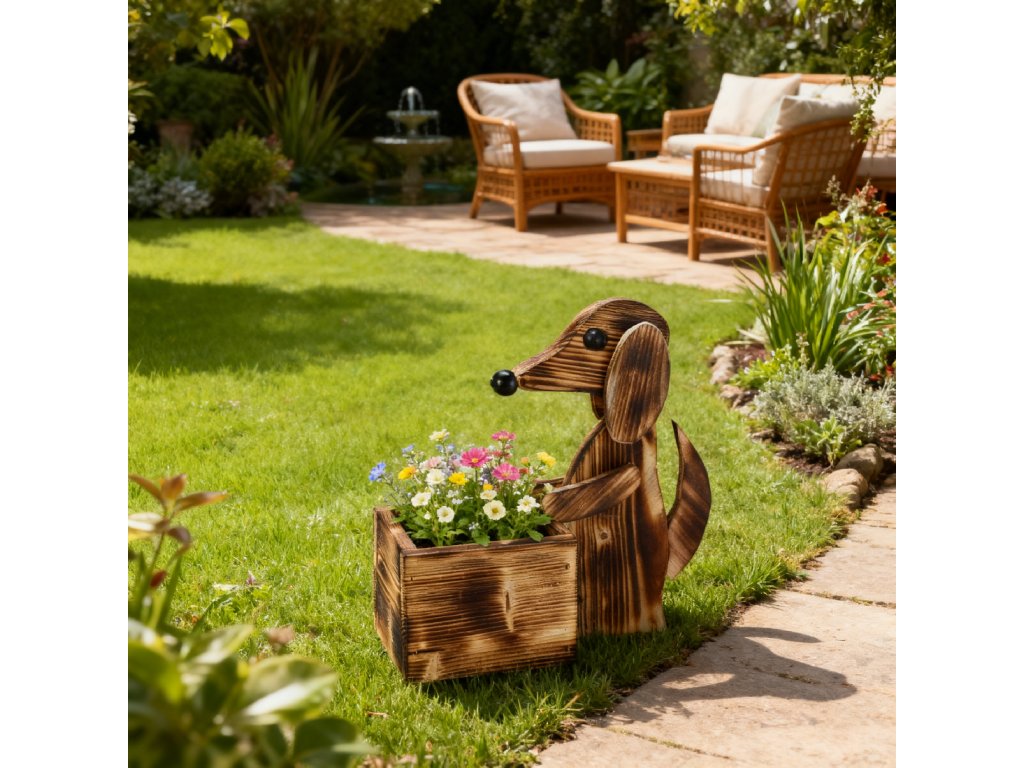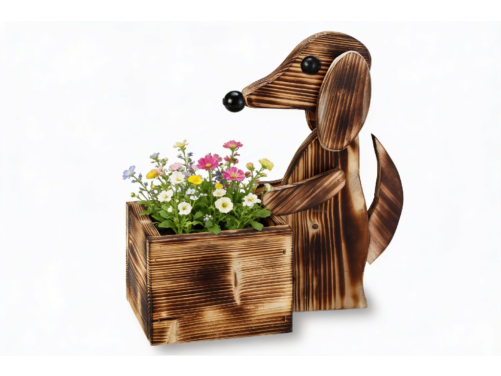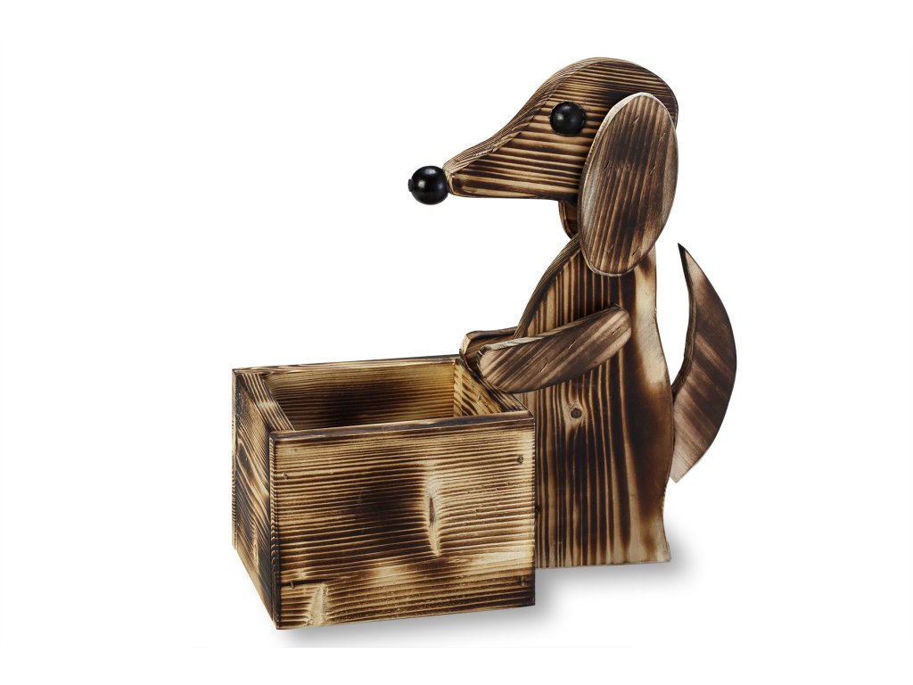 Dekoratívny obal na kvetináč je dodávaný s motívom roztomilého psíka. Na výrobu obalu na kvetináč bolo použité smrekové drevo. Smrekové drevo je prírodým materiálom, ktorý má veľmi ľahkú hmotnosť a napriek tomu sa vyznačuje veľmi dobrou pevnosťou materiálu. Veľkou prednosťou je cenová dostupnosť materiálu. Povrch obalu na kvetináč bol upravený tradičnou metódou opaľovania plameňom. Jedná sa o veľmi obľúbenú a nadmieru praktickú úpravu dreveného povrchu, ktorá poskytuje mnoho výhod.