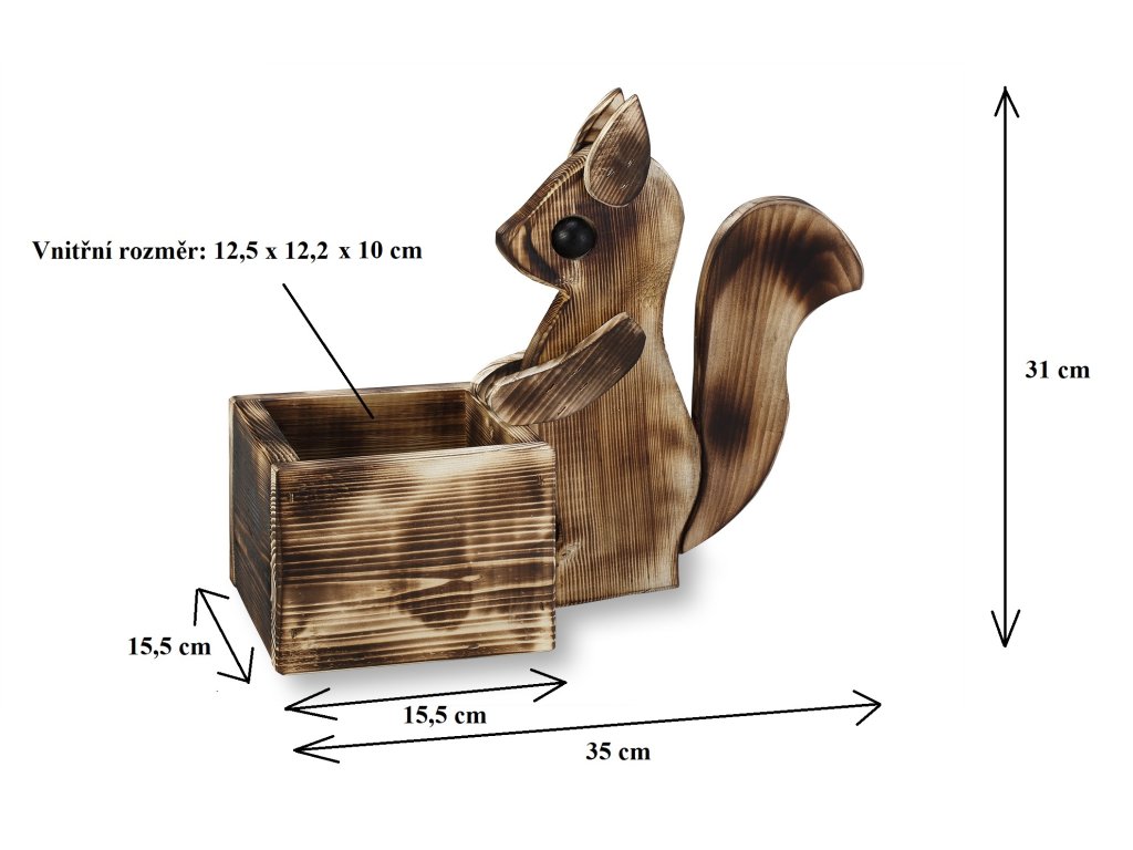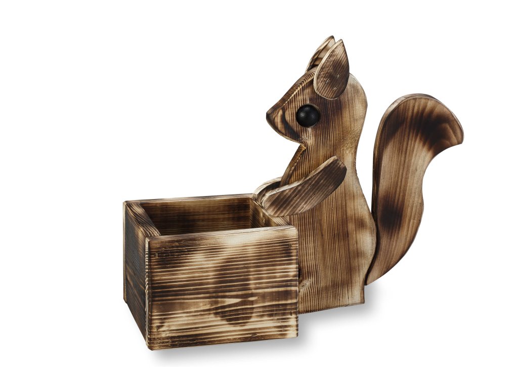 Dekoratívny drevený obal na kvetináč s motívom veveričky je vyrobený z opáleného smrekového dreva. Dekoratívny obal je dodávaný bez PVC kvetináča a bez kvety. Je určený pre kvetináč s maximálnym rozmerom 12,5 x 12,5 x výška 10 cm. Rozveseľte svoju záhradku s týmto milým záhradným doplnkom, ktorý Vám pri každej návšteve záhrady vykúzli úsmev na perách.