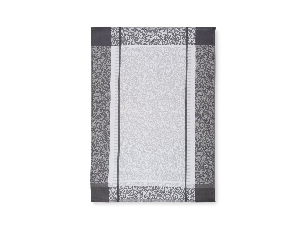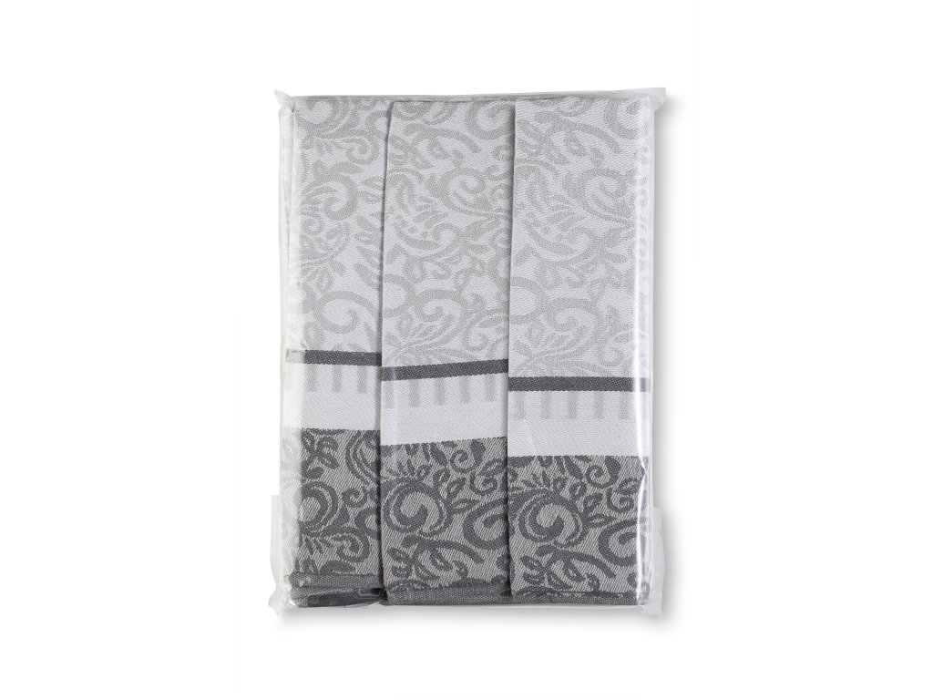 Balenie obsahuje 3 ks žakárových utierok s motívmi sivých ornamentov. Lícová strana utierky je vždy zrkadlovým odrazom rubovej strany.