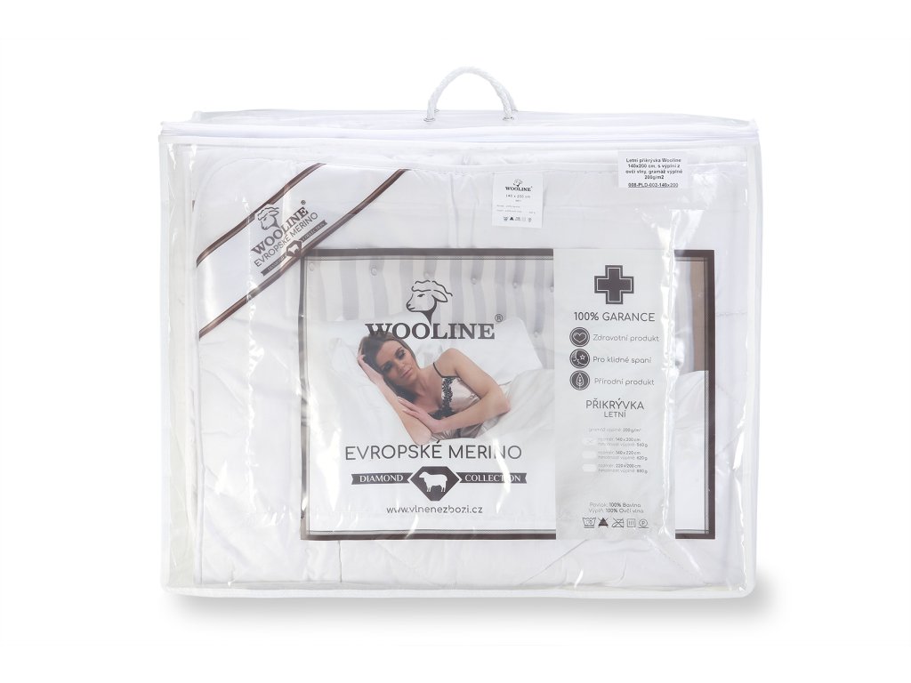 Letná prikrývka Wooline s výplňou z ovčej vlny ponúka špičkové parametre vo všetkých ohľadoch. Prikrývka má vlastnosti používané pri lekárskej rehabilitácii. Má schopnosť udržiavať teplotu tela na konštantnej úrovni, čo umožňuje oddýchnuť si a zaspať za pohodlných podmienok. Poskytuje dobré vetranie, ľudská koža dýcha správne a telo je dostatočne okysličené. Rozmer prikrývky je 140cm x 200cm.