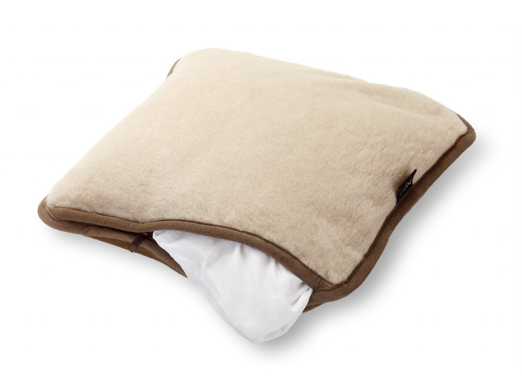 Materiál: 95% Austrálske Merino + 5% ťavia vlna; Rozmer: 40 cm x 40 cm; Farba: rubová strana svetlohnedá, lícová strana tmavohnedá. Lem - tmavohnedá farba; Výplň: 100% silikónové guľôčky; Gramáž: 500 - 550g/m2; Prateľný poťah: ÁNO